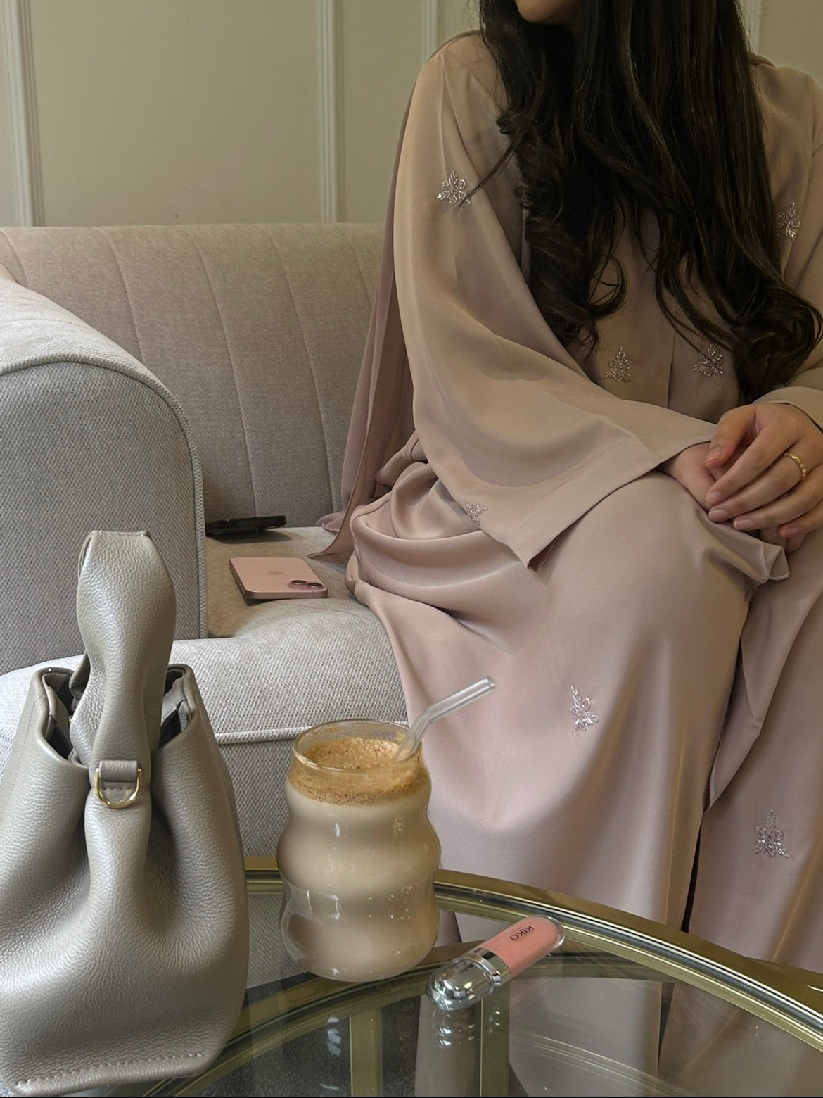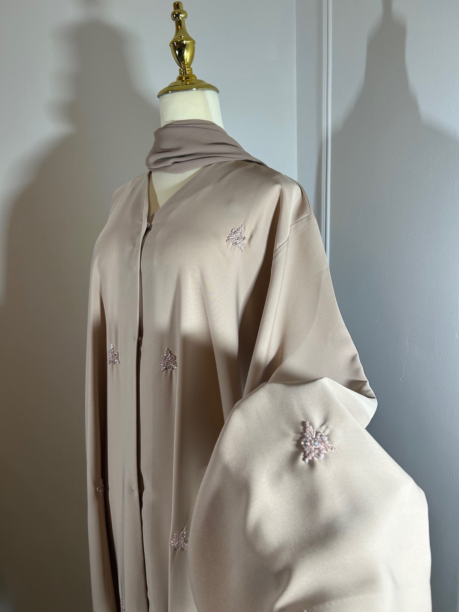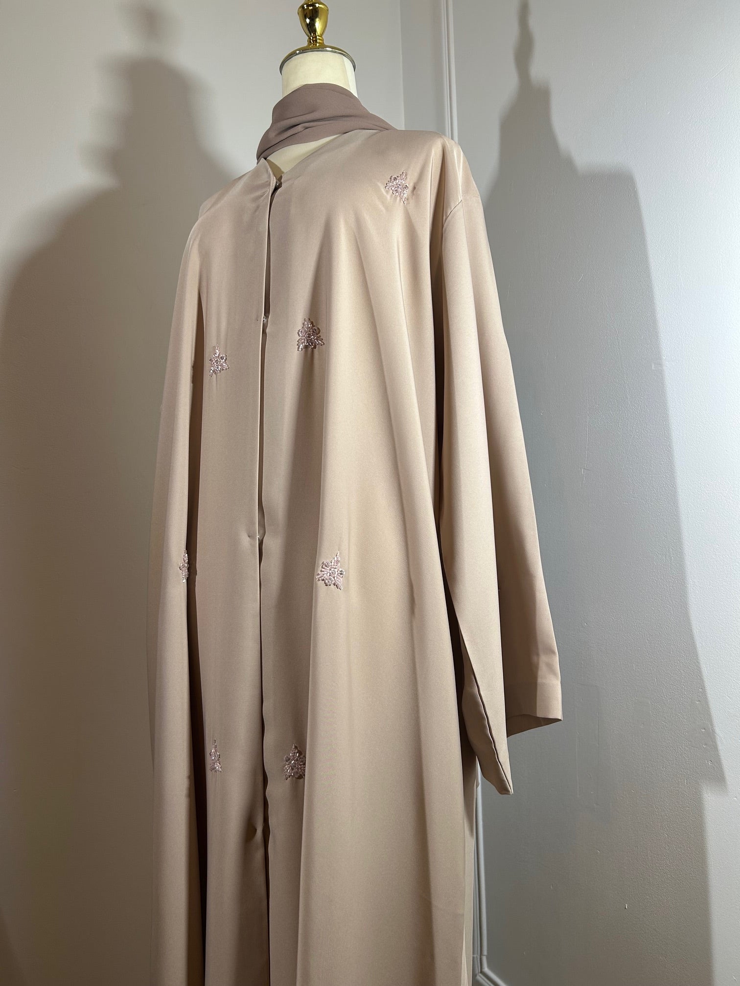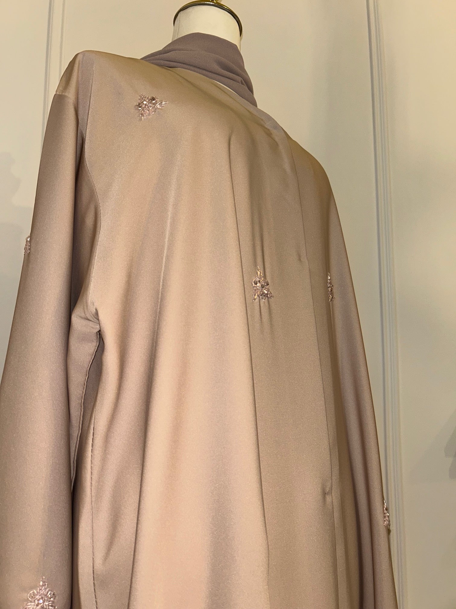Exquisitely crafted from a soft pink, premium Nida fabric, our Marha abaya features delicate, all-over embellishments that shimmer subtly with every movement. Designed with refined button fastening and paired with a perfectly coordinated hijab, this piece embodies understated luxury and timeless sophistication.